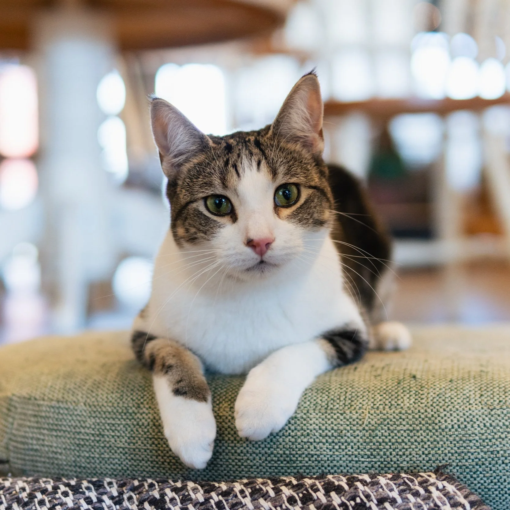 Mark is a real sweetheart. He is very affectionate and loving, and once he’s comfortable with you he will curl up on your lap for a snuggle. Sometimes, especially if it’s busy, he prefers to observe from afar, but other times he’ll come right at you with smooches and purrs.